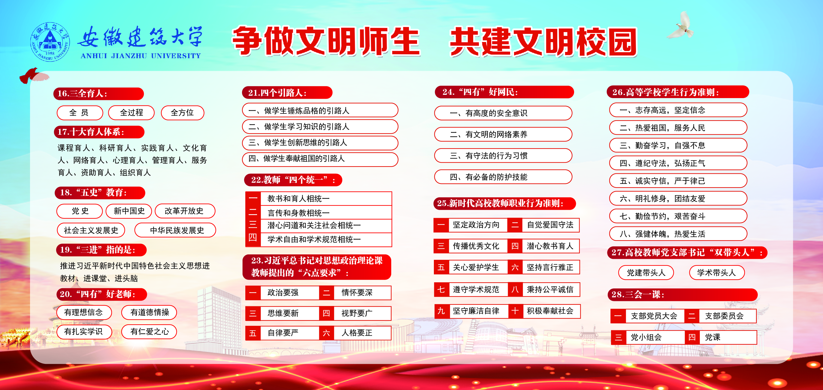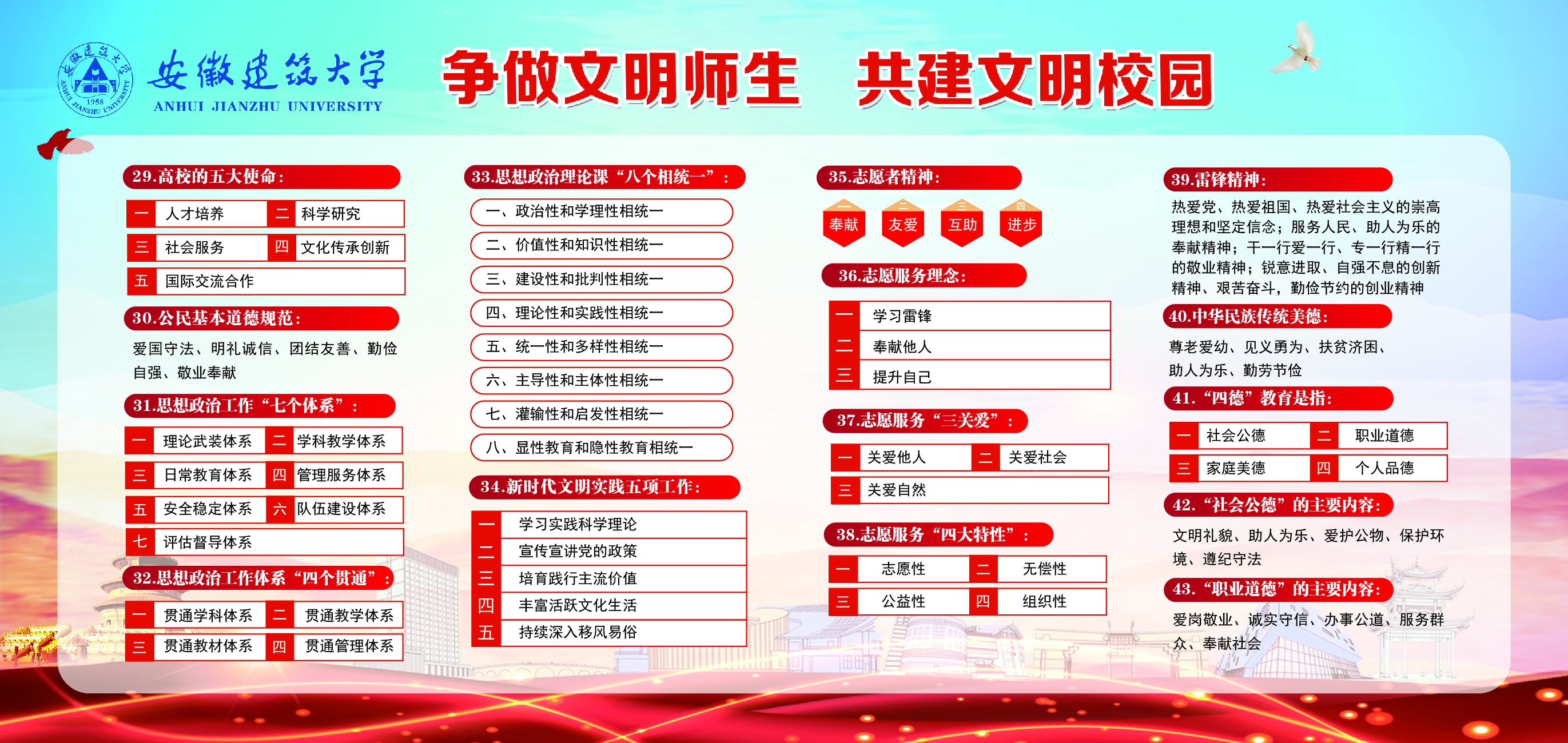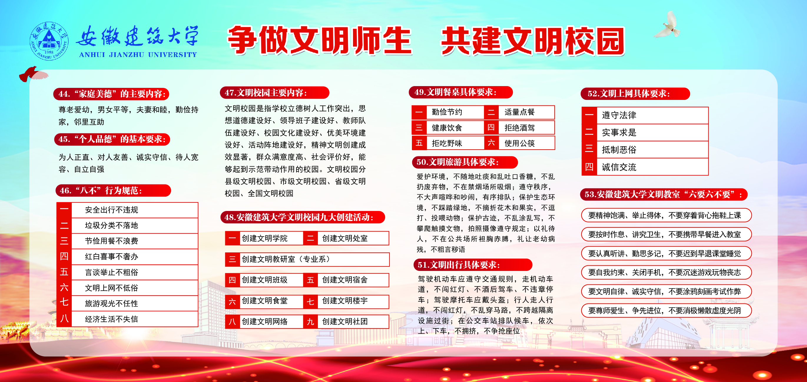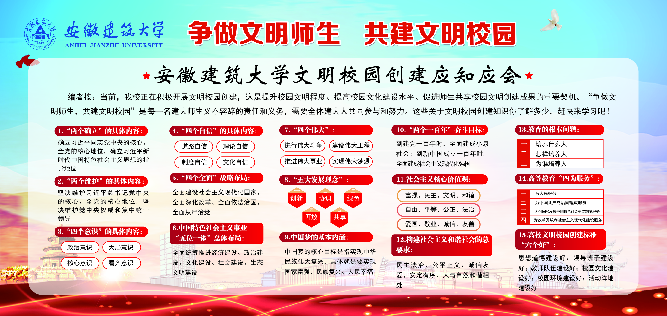 编者按:当前,beat365正在积极开展文明校园创建,这是提升校园文明程度、提高校园文化建设水平、促进师生共享校园文明创建成果的重要契机。“争做文明师生,共建文明校园”是每一名建大师生义不容辞的责任和义务,需要全体建大人共同参与和努力。这些关于文明创建知识你了解多少,赶快来学习吧!