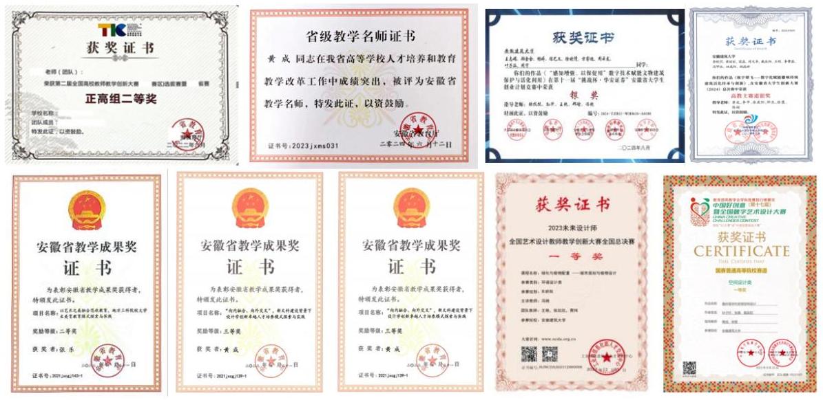 近年来,学院获得国家社科基金艺术学项目、国家艺术基金、教育部人文社科项目、安徽省哲学社会科学规划项目等省部级科研课题40项,近年来纵横向项目科研经费近1000万元;发表学术论文150多篇, 其中在CSSCI、SSCI、SCI、EI等学术期刊发表论文近20篇;获得国家专利、外观设计专利、实用新型专利20项,出版专著10余部。学生在参加国挑战杯、中国大学生国际创新大赛等国家级、省级学科专业大赛中获得了金奖(一等奖)60多项。部分成果如图所示: