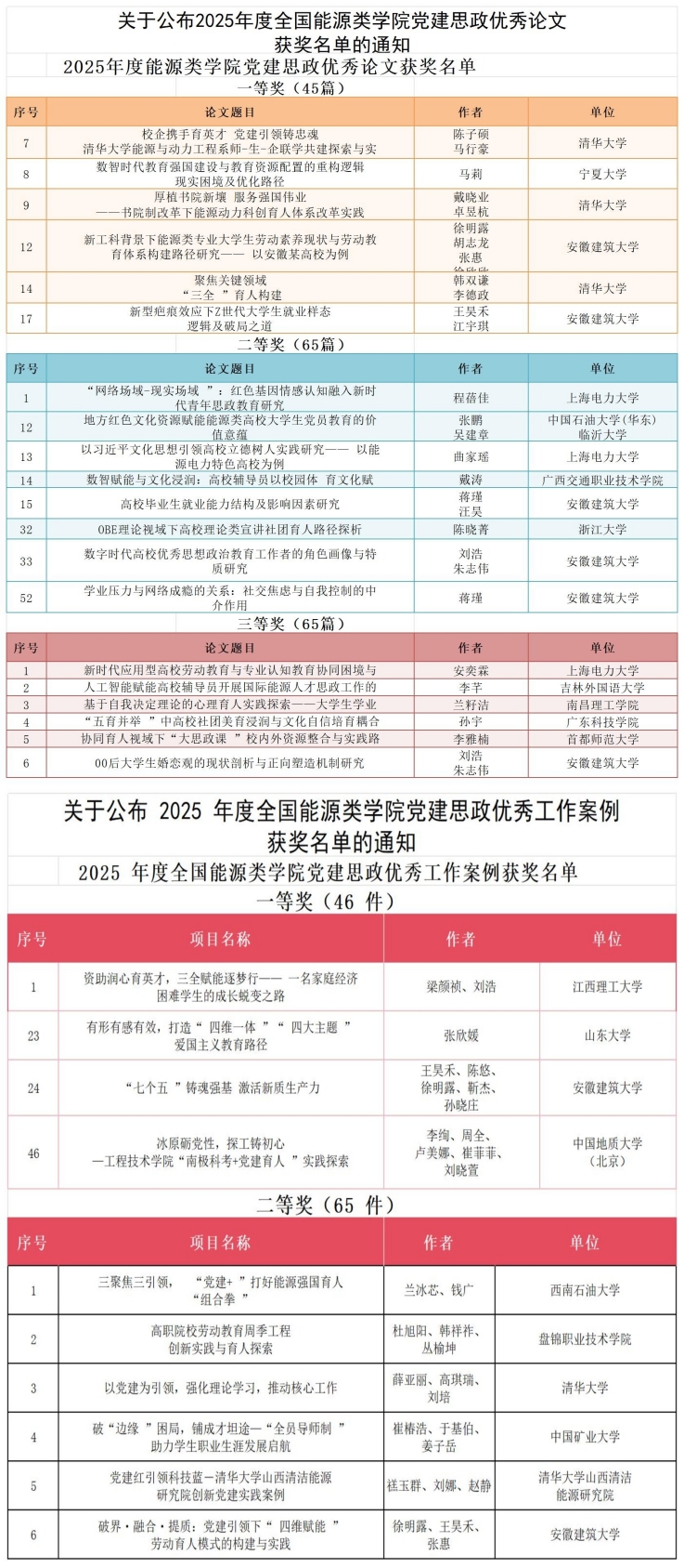 党建品牌建设成效显著。2022年学院党委获批安徽省首批“全省党建工作标杆院系”,学院多次斩获校“宣传工作先进单位”“校园十佳网站”“优秀微信公众号”“就业工作先进单位”“学校先进基层党组织”等荣誉称号。学院基层党支部建设成果丰硕,先后有5个党支部获校级“先进基层党组织”称号,2个党支部成为省级“双创”样板党支部,3个党支部成为学校“双创”样板党支部,1个教师党支部通过校级首批“双带头人”教师党支部书记工作室验收,1个教师党支部获批校“双带头人”教师党支部书记工作室建设单位,且所有党支部连续3年在学校党支部标准化建设验收中实现100%达标。撰写的党建工作案例获全国高校思想政治工作创新发展论坛优秀工作案例、安徽省基层思想政治工作优秀创新案例、全国能源类学院党建思政优秀工作案例一等奖1项、二等奖1项;撰写的党建论文获全国能源类学院党建思政优秀论文一等奖3项、二等奖3项、三等奖1项。