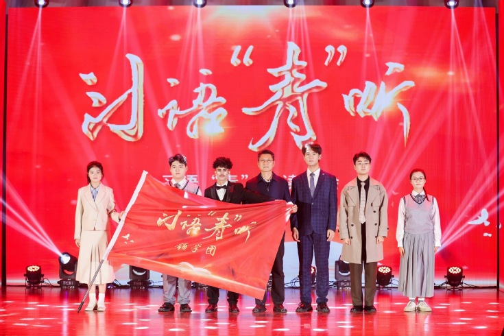马文革为习语“青”听领学团代表授旗,这面旗帜将激励着领学团的同学们在今后继续深入学习习近平新时代中国特色社会主义思想,感悟时代伟力,担当起传播和践行总书记重要讲话精神的责任。