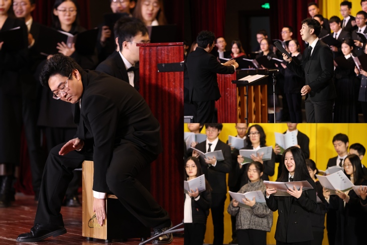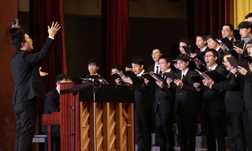 演出在悠扬的钢琴声中缓缓拉开帷幕,首先由男声合唱团为大家带来了改编自《诗经》的经典合唱曲目《在水一方》与《蝶恋花》。观众在悠扬的歌声中感受到了古代文人的浪漫情怀与现代人对于美好生活的共同向往。音乐会随后演绎了哈萨克民歌《等你到天明》、贵州民歌《摘菜调》、客家语作品《花树下》,丰富民族语言和民族风格,不仅展示了中华文化的博大精深与多元魅力,更传递了各民族之间团结友爱、和谐共生的美好愿景,观众在音乐中深刻体会到了民族团结的伟大力量。
