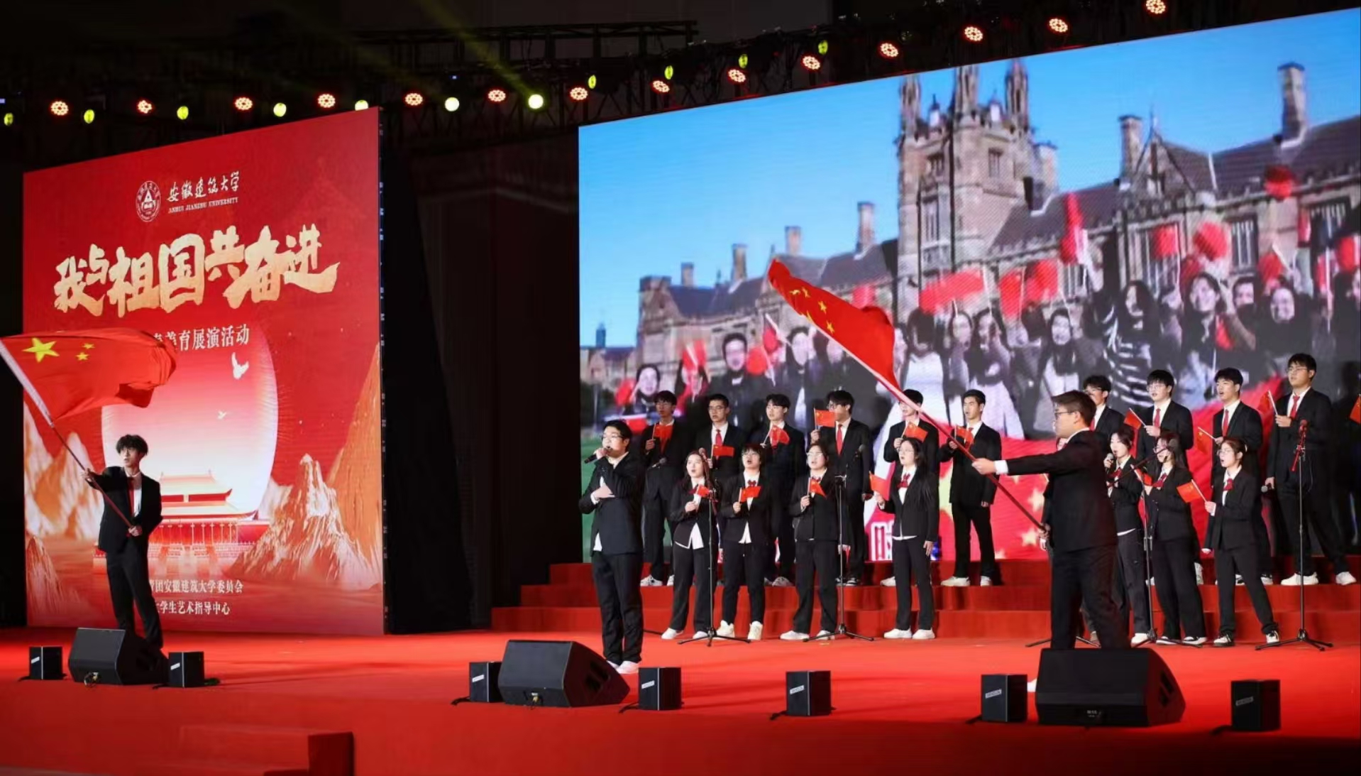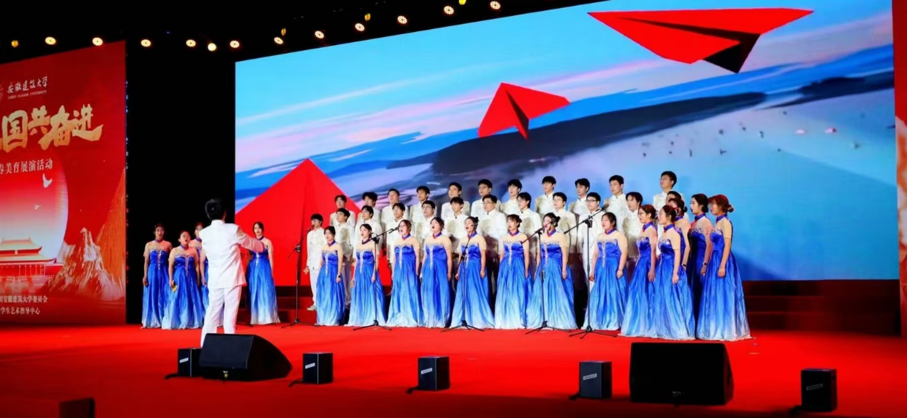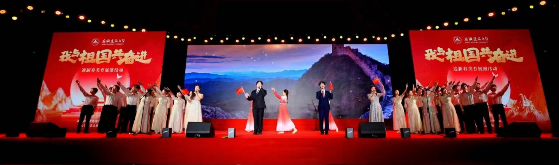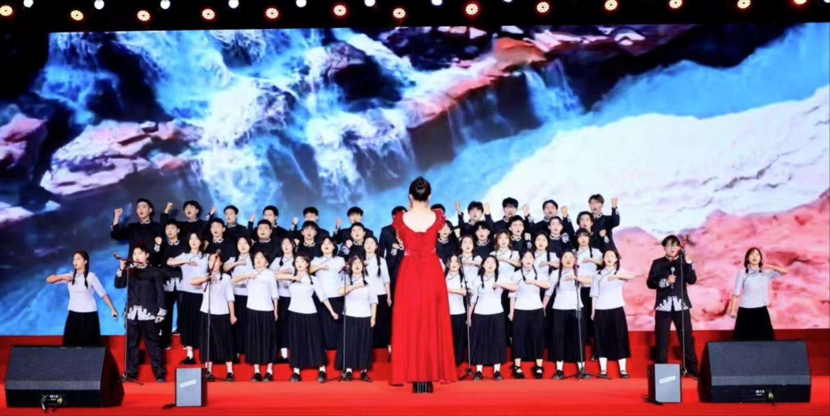 《歌唱祖国》那熟悉经典的旋律引发全场大合唱,深情的歌声唱出了全体师生与祖国心心相印、共同奋进的心声,歌声中,有对祖国大好河山的赞美,有对祖国辉煌成就的自豪,更有对祖国未来发展的坚定信心,为整个展演活动画上了圆满的句号。