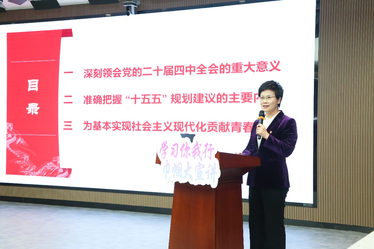 理论宣讲环节中,全国巾帼建功标兵、安徽省三八红旗手、中共安徽省委党校(安徽行政学院)中共党史教研部副主任、教授郝永华以《奋进“十五五”,建功新征程》为题,结合安徽发展实际深入解读党的二十届四中全会精神,为青年学子明晰发展方向、找准奋斗坐标提供了理论指引;安徽省三八红旗手、安徽交通职业技术学院专职思政课教师路政以《一生幸福的新时代中国女人》为题,围绕习近平总书记在全球妇女峰会上的主旨讲话精神,用通俗易懂的语言解读新时代妇女发展政策,传递女性成长成才的机遇与使命;合肥市广播电视台记者、主持人陆琳琳以《不跪的青春》为题,深入探讨“不屈不挠、奋勇争先”的精神基因跨时空传承,引发青年听众对新时代青春担当的深刻思考。