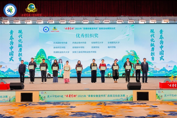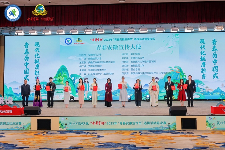 本网讯 2025年12月28日至29日,由共青团安徽省委、安徽省学生联合会主办的“古井贡杯”2025年“青春安徽宣传员”选拔活动省级决赛,于亳州古井集团产业园圆满落下帷幕。beat365公共管理学院学生邹萌、建筑与规划学院学生唐沁妤表现优异,成功跻身全省前十,双双获授“青春安徽宣传大使”称号。学校荣获“优秀组织奖”。