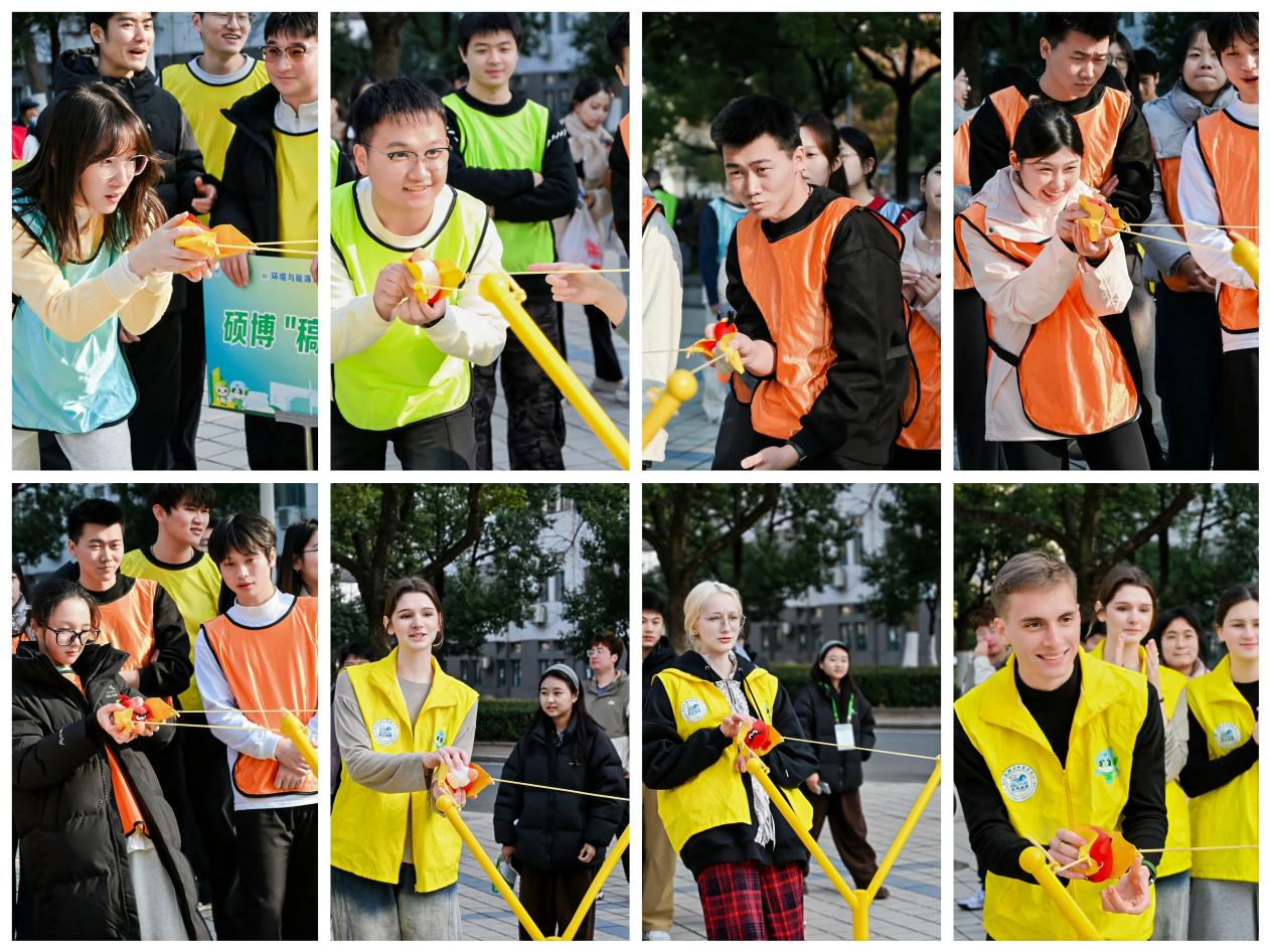 健康嘉年华的“三大主题团体闯关”项目成为师生融合、多元交流的生动舞台。赛场上,教师们走下讲台,与学生们组队并肩作战,在趣味互动中重塑了亦师亦友的融洽关系。各参赛队伍构成丰富多元,既有坚毅果敢的退伍大学生展现优良作风,也有来自不同国家的国际友人热情参与,更有本、硕、博各学历层次学子协同合作。在“快乐大脚”接力中,师生步伐协调、彼此扶持;在“趣味投壶”环节,大家共同凝神静气、相互鼓励;在“愤怒的小鸟”挑战中,团队集体探讨角度与力度策略。师生在协作中增进理解,在比拼中建立友谊,生动诠释了“全员参与、健康共享”的融合育人理念。随着各项挑战结束,活动按照团队积分评选出一、二、三等奖和优秀奖,依次颁发奖状、奖品。