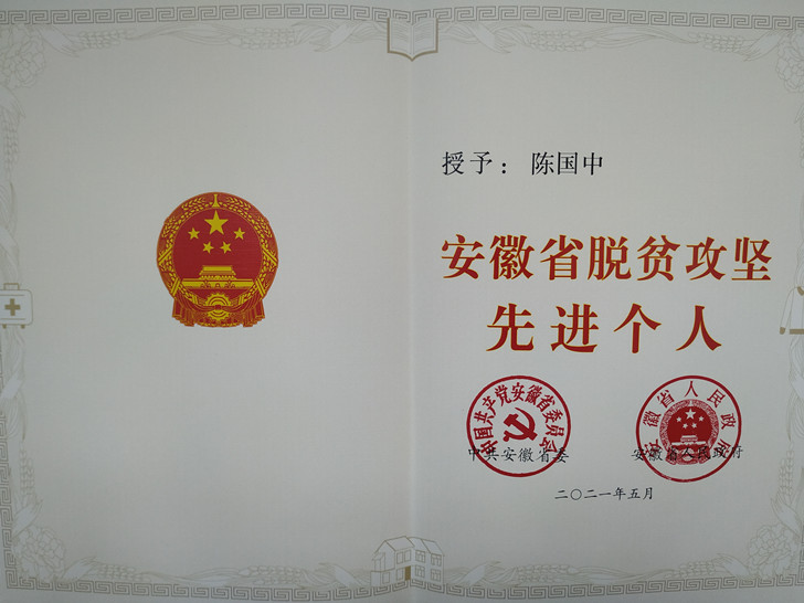 本网讯 近日,安徽省脱贫攻坚总结表彰暨巩固拓展脱贫攻坚成果同乡村振兴有效衔接工作推进大会在合肥隆重召开,会上对全省在脱贫攻坚中表现突出的个人和集体给予通报表彰,学校驻舒城县汤池村扶贫工作队队长陈国中同志荣获“安徽省脱贫攻坚先进个人”称号。