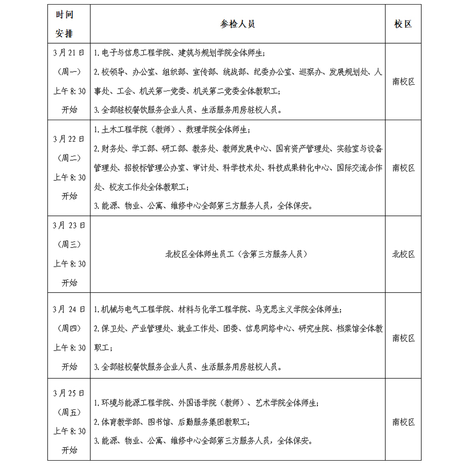 按上级疫情防控部门要求,本周学校每天按照20%比例组织师生开展核酸检测,做到五天全覆盖,具体安排如下: