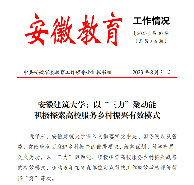 本网讯 近日,《安徽教育工作情况(〔2023〕第30期)》以“beat365在线唯一官网:以‘三力’聚动能 积极探索高校服务乡村振兴有效模式”为题,专题宣传学校乡村振兴工作成效。