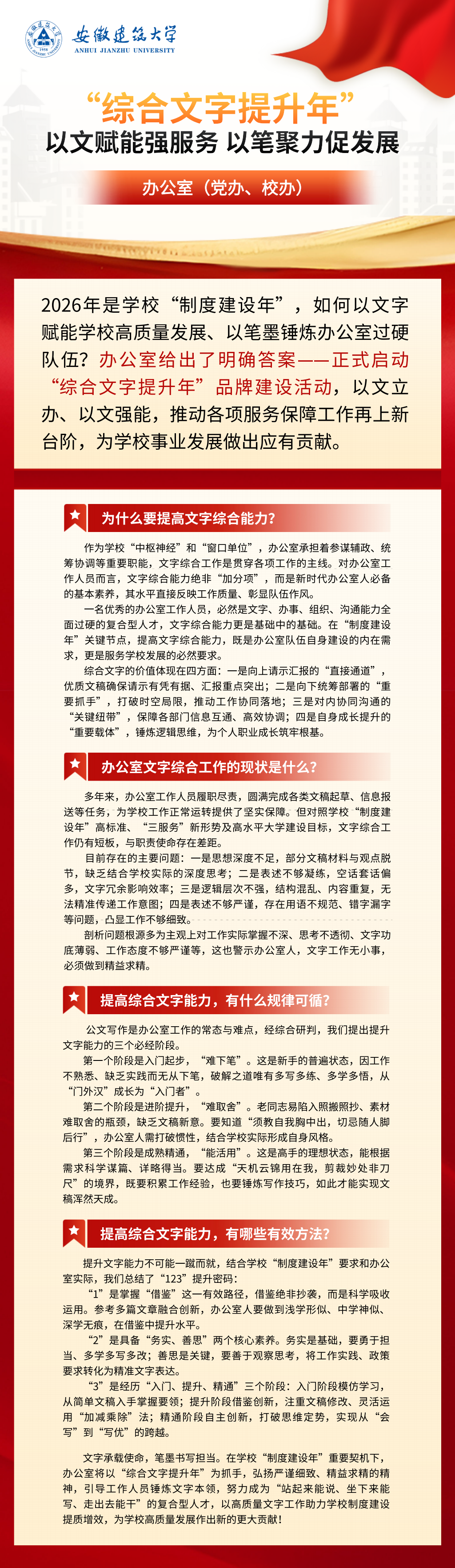 本网讯 为深入贯彻落实学校“制度建设年”工作部署,充分发挥办公室以文辅政、服务大局的核心职能,着力提升综合文字工作规范化、专业化、精品化水平,3月6日,办公室启动“综合文字提升年”品牌建设活动,通过强化学习、锤炼本领、优化作风,全面提高文稿质量与服务效能,为学校高质量发展提供坚实文字保障。
