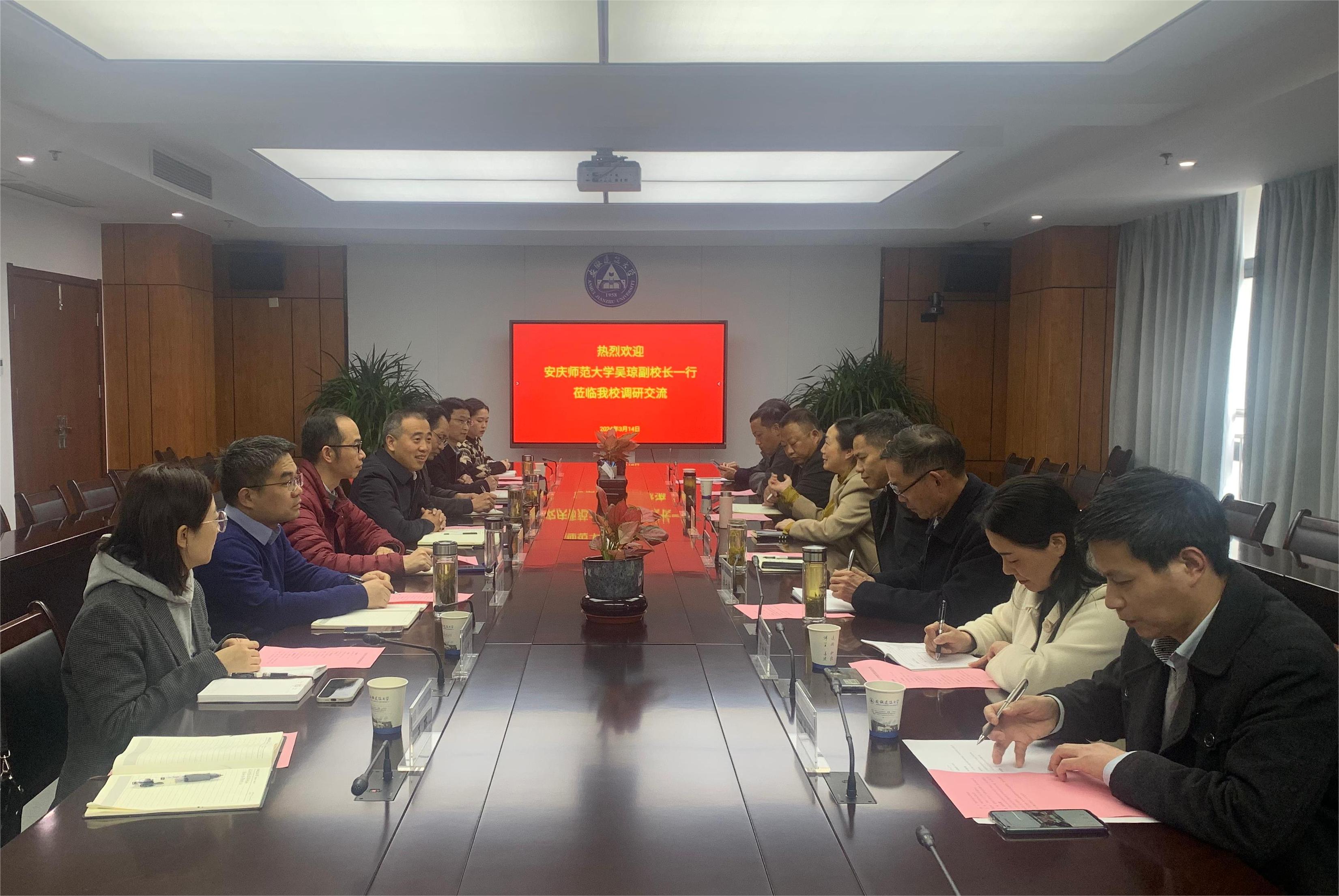 本网讯 3月14日,安庆师范大学党委常委、副校长吴琼一行8人来校调研交流。校党委常委、副校长闵杰,教务处、机关一党委、信网中心等单位负责人及评建办工作人员参加会议,会议由闵杰主持。