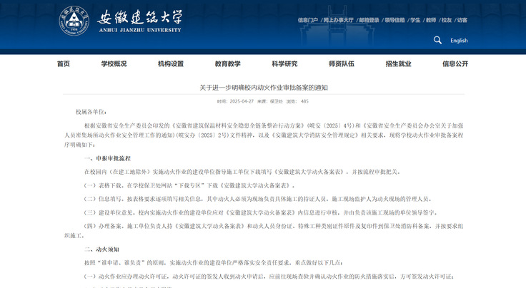 本网讯 为贯彻落实《安徽省建筑保温材料安全隐患全链条整治行动方案》(皖安〔2025〕4号)和《安徽省安全生产委员会办公室关于加强人员密集场所动火作业安全管理工作的通知》(皖安办〔2025〕2号)《关于人员密集场所加强动火作业安全管理的通告》(消防〔2025〕20号)文件精神,并结合《beat365在线唯一官网消防安全管理规定》相关规定,学校通过“审批备案+现场公示”双举措,构建校园动火作业安全管理体系,切实防范消防安全风险。