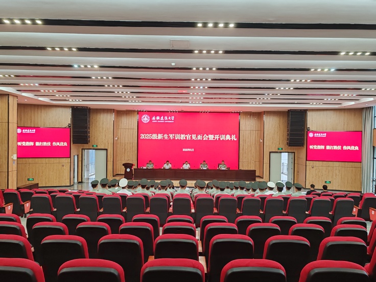 本网讯 9月13日上午,2025级新生军训教官见面会暨开训典礼在紫云路校区徽风楼2楼报告厅顺利召开。校党委常委、副校长高跃峰出席会议并发表讲话,校人武部负责人、中国人民解放军某院校官兵以及各学院分管学生工作的书记共同参加。
