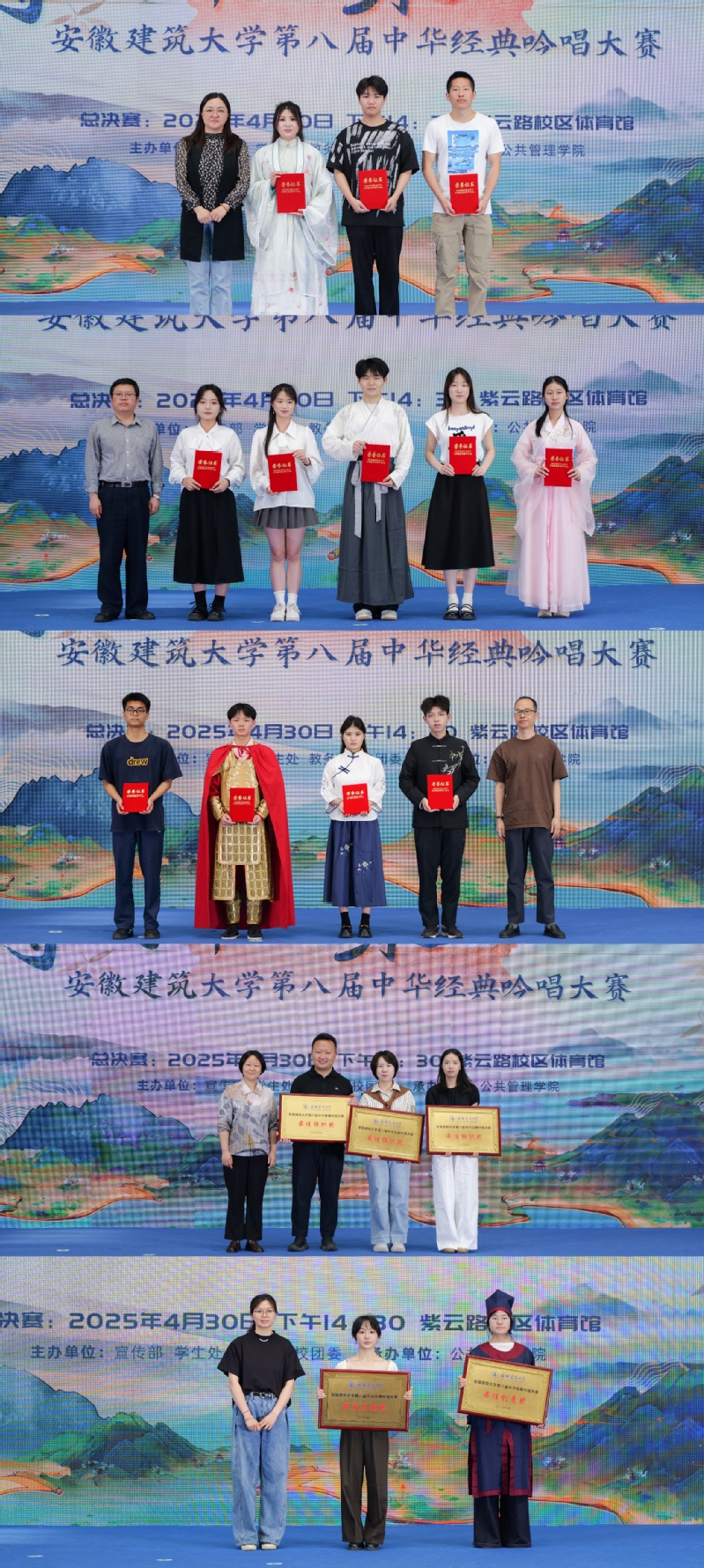经过评委组从内容创意、表演形式、教育意义等维度的综合评审,公管学院《清吟离骚 廉心常存》等三组节目获一等奖,电信学院《光的赞歌》等五组节目获二等奖,材化学院《满江红》等六组节目获三等奖。土木学院、经管学院、电信学院学院获最佳组织奖,艺术学院获最佳表演奖,机电学院获最佳创意奖。