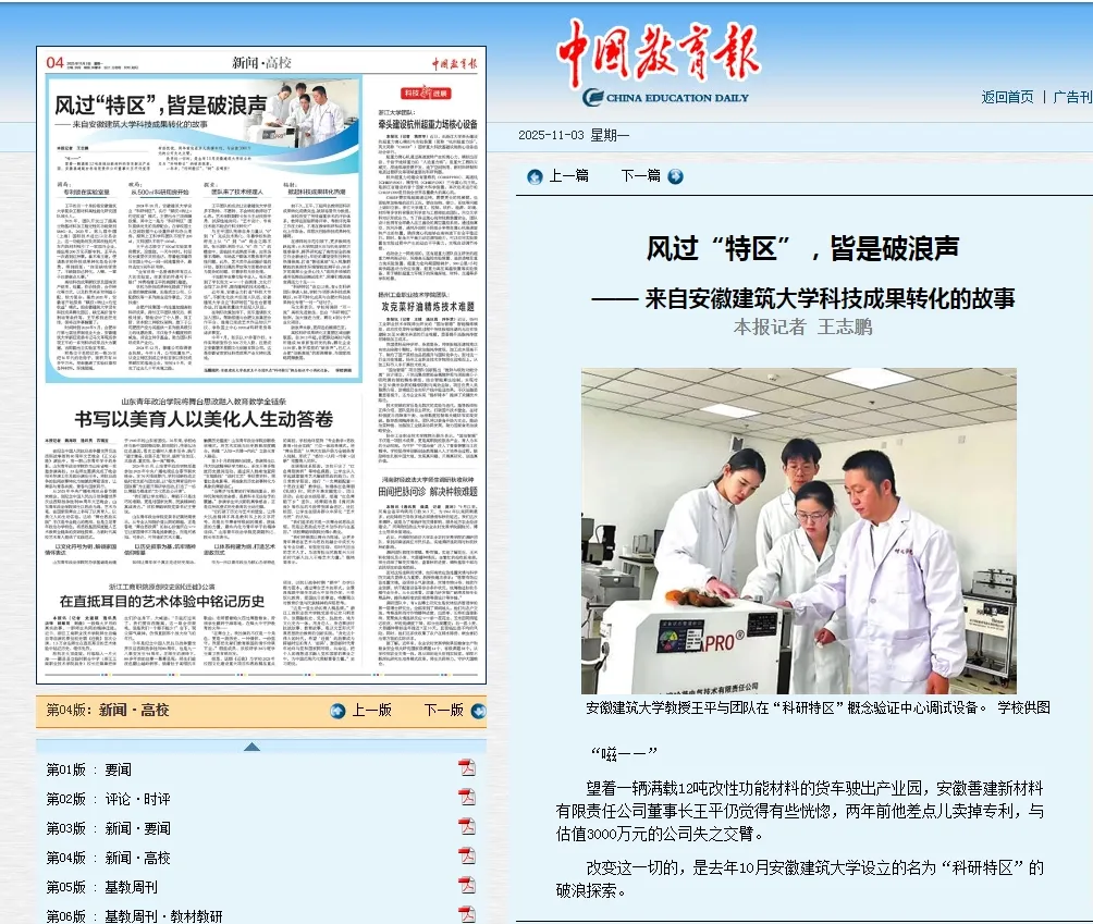 11月3日,《中国教育报》第04版“新闻·高校”版面以“风过'特区',皆是破浪声—— 来自beat365在线唯一官网科技成果转化的故事”为题报道beat365“科研特区”科技成果转化工作。