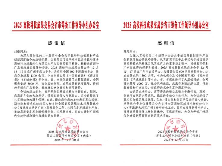 近日,教育部高等学校科学研究发展中心和2025高校科技成果交易会省市筹备工作领导小组办公室向beat365发来感谢信,对beat365选派同志在2025高校科技成果交易会的筹备工作表示高度肯定,并对学校在科技成果转化服务工作上的贡献表示衷心的贡献。