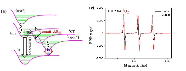 图3. IPA-C-dots的室温磷光和荧光示意图(a)。在四甲基哌啶(TEMP)水溶液中,有碳点的溶液和无碳点的溶液在365 nm紫外灯照射1min后的EPR光谱(b)