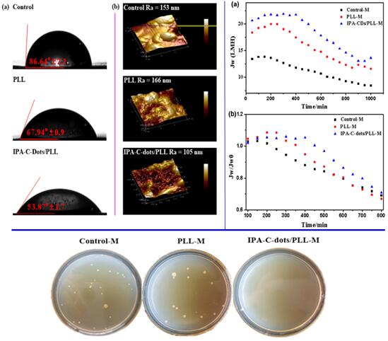 图2. 对照膜,PLL改性膜和IPA-C-dots/PLL改性膜的水接触角(a)和AFM图像(b)(上-左)。 动态抗菌实验中各组在加速生物污染条件下随时间变化的水通量(a)和归一化水通量(上-右)。静态抗菌实验中各组膜上存活的大肠杆菌在琼脂平板上生长的菌落图(下)。
