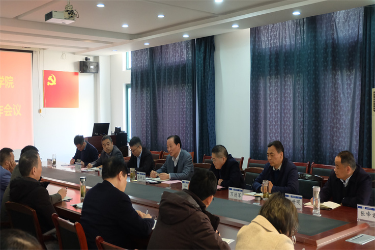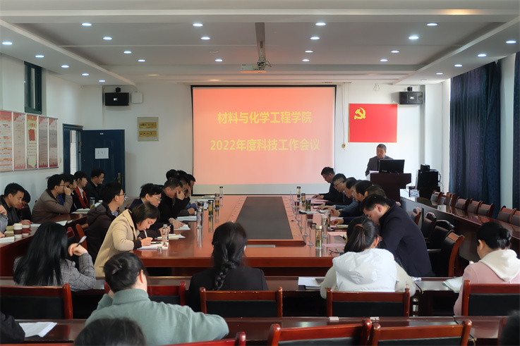 材化学院党委书记万德军致欢迎词。副院长丁益做了学院2021年度科技工作总结及2022年度工作计划汇报。