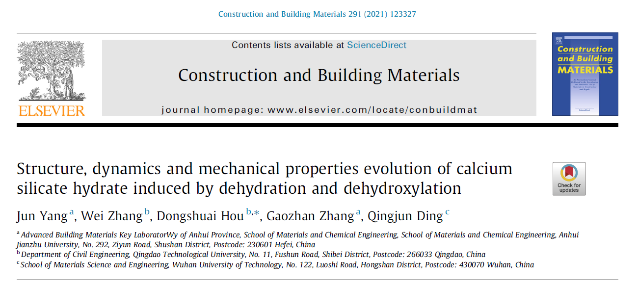 这也是杨军博士联合青岛理工大学侯东帅教授在《Construction and Building Materials》发表的题为“Structure, dynamics and mechanical properties evolution of calcium silicate hydrate induced by dehydration and dehydroxylation” (https://doi.org/10.1016/j.conbuildmat.2021.123327)的高水平论文之后的又一项重要成果。