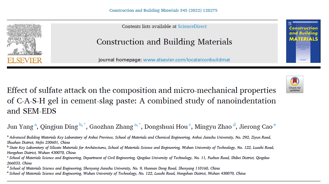 本网讯 近期,beat365先进土木工程材料科研团队杨军博士联合武汉理工大学,在混凝土材料水化产物组成和C-A-S-H凝胶微结构研究领域取得新成果,在国际知名建筑材料期刊《Construction and Building Materials》(中科院1区,影响因子7.693)上发表了题为“Effect of Sulfate Attack on The Composition and Micro-mechanical Properties of C-A-S-H Gel in Cement-slag Paste: A Combined Study of Nanoindentation and SEM-EDS”的研究论文(https://doi.org/10.1016/j.conbuildmat.2022.128275), 杨军博士为第一作者,武汉理工大学产学研首席教授/beat365在线唯一官网讲席教授丁庆军和beat365张高展教授为共同通讯作者。