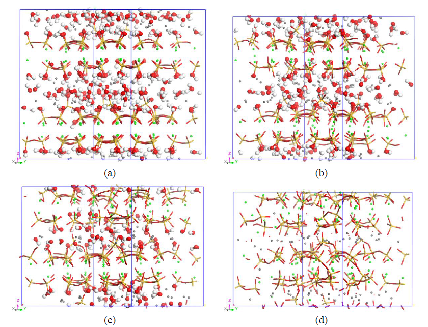 Figure 2. Molecular structures of the C-S(-H) with hydration degree of (a) 100%, (b) 60%, (c) 30% and (d) 0%. The molecular structures for all the models are presented in Supporting Information. (Yellow and red sticks represent the Si-O bonds; red and white ball-sticks represent hydroxyls and water molecules; green and gray spheres are calcium atoms in principal layers and interlayer regions, respectively; red points denote ionic oxygen atoms)