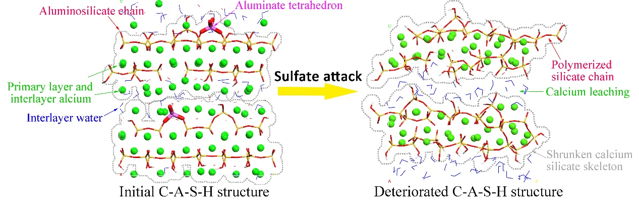 Fig. Schematic illustration of the nanostructure deterioration in C-A-S-H induced by sulfate attack