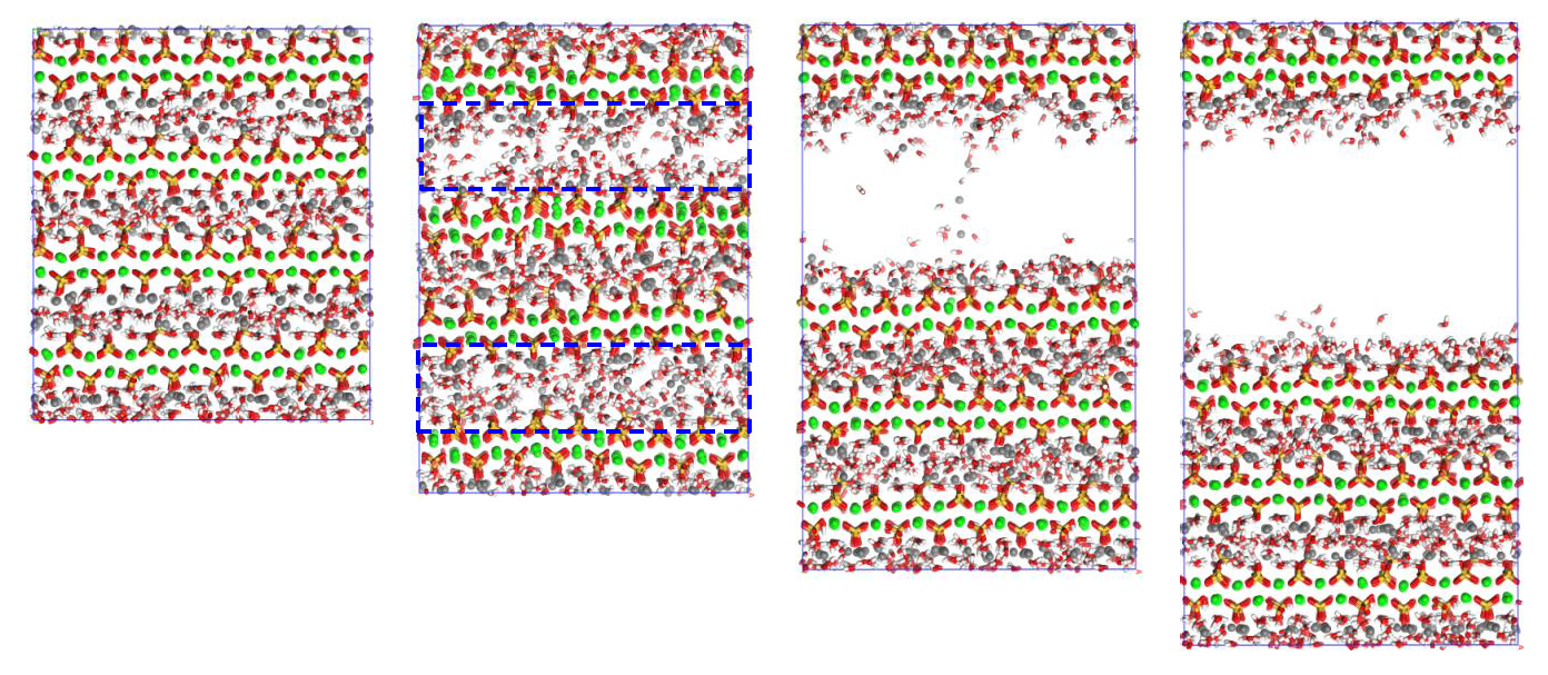 Figure 14. Molecular structure evolution (view along y direction) of C-S(-H) models with hydration degrees of 100% (first row) and 0% (second row) during z axial tensioning. The first, second, third and fourth columns are configurations at strains of 0.0, 0.2, 0.4 and 0.6 Å/Å, respectively.
