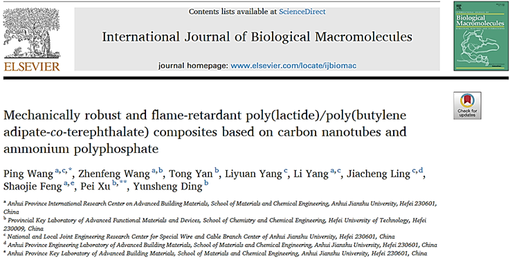 近日,beat365材料科学与化学工程学院本科生王振峰在其导师王平副教授的指导下,在国际著名期刊《International Journal of Biological Macromolecules》(IF=8.03,中科院1区(化学TOP期刊)上发表题为《Mechanically robust and flame-retardant poly(lactide)/poly(butylene adipate-co-terephthalate) composites based on carbon nanotubes and ammonium polyphosphate》(doi.org/10.1016/j.ijbiomac.2022.09.033.)的研究论文,该论文是王振峰同学本科毕业论文成果的总结和凝练。