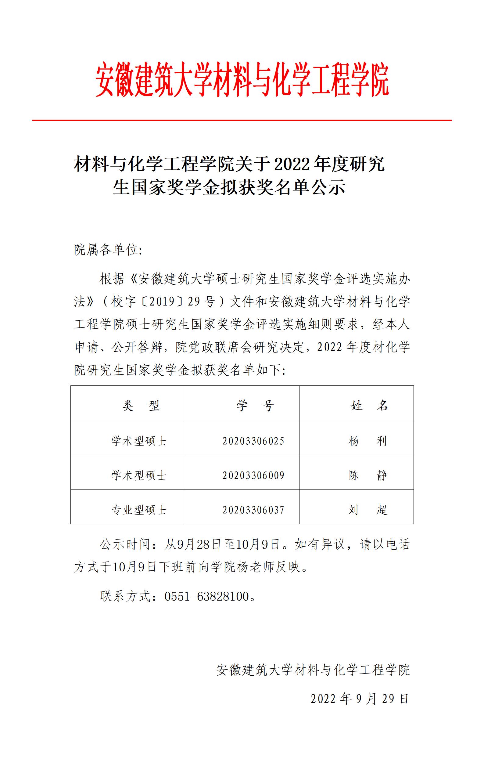材料与化学工程学院关于2022年度研究生国家奖学金拟获奖名单公示