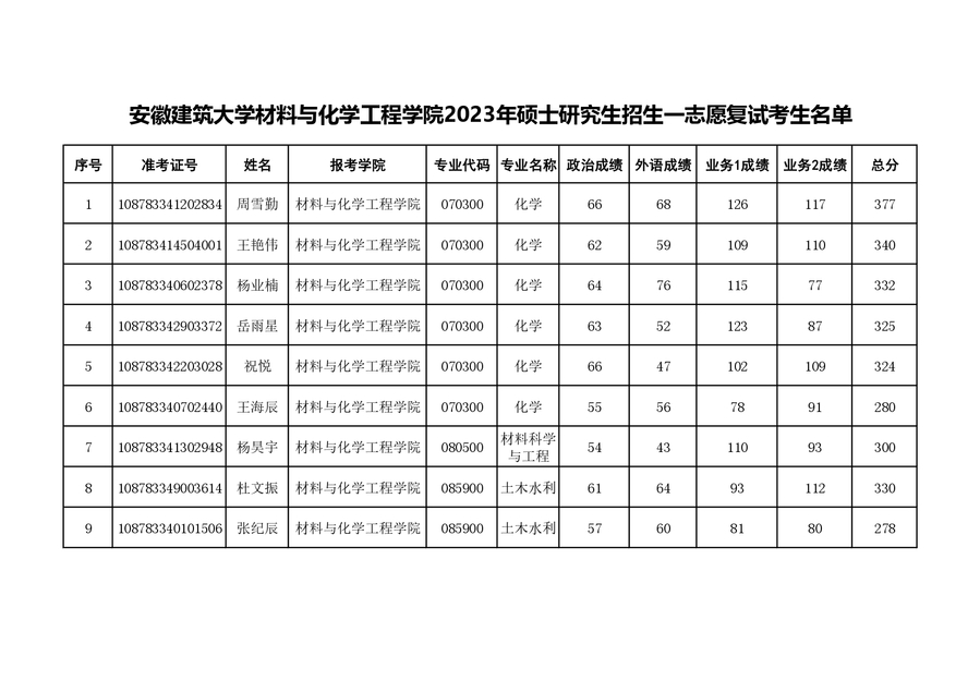 beat365在线唯一官网材料与化学工程学院2023年硕士研究生招生一志愿复试考生名单