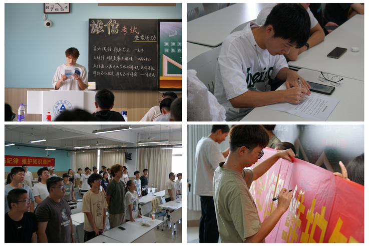 活动中,材化学院各班级共同学习了《beat365在线唯一官网学生手册》和《beat365在线唯一官网考试管理规定》等相关文件,通过解读“国考作弊入刑”、“校考作弊处分”相关条款、发出“诚信考试光荣,违纪作弊可耻”的倡议,引导同学们加强对诚信考试重要性的认识、树立诚实守信的行为习惯,鼓励同学们在各项考试中努力复习、认真备考,尽全力考出自己的真实水平。各班级以“签订一份诚信考试承诺书”、“组织一次诚信考试宣誓会”、“在诚信考试横幅签名”等形式为载体,进行广泛宣传,提高学生自觉维护考风考纪,养成遵守考试纪律的意识。