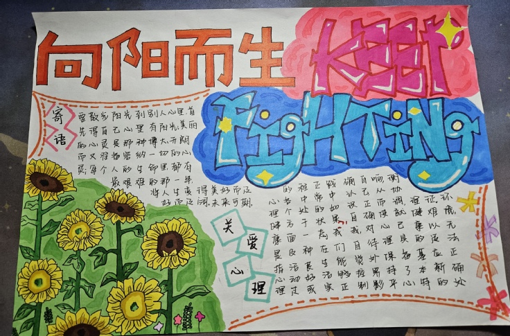 活动宣传后,获得了广大材化学子的积极参与。这些手抄报作品以自我认知、情绪管理、压力应对等心理健康主题为核心,用图画、文字、色彩等多种方式表达参赛选手对心理健康的理解和探索,不仅展现出了同学们的艺术才华,更展示了他们对于自身心理健康的关注和认识。比赛现场,选手们通过PPT的讲解,向现场评委与观众展示他们创作的心路历程,并且对于手抄报画面进行更深刻的解读,与现场观众产生情感共鸣。最终,23无机非1班的翁欣雨、王训婧小组因色彩饱和绚丽、画面丰富的参赛作品获得了本次心理手抄报活动的一等奖。