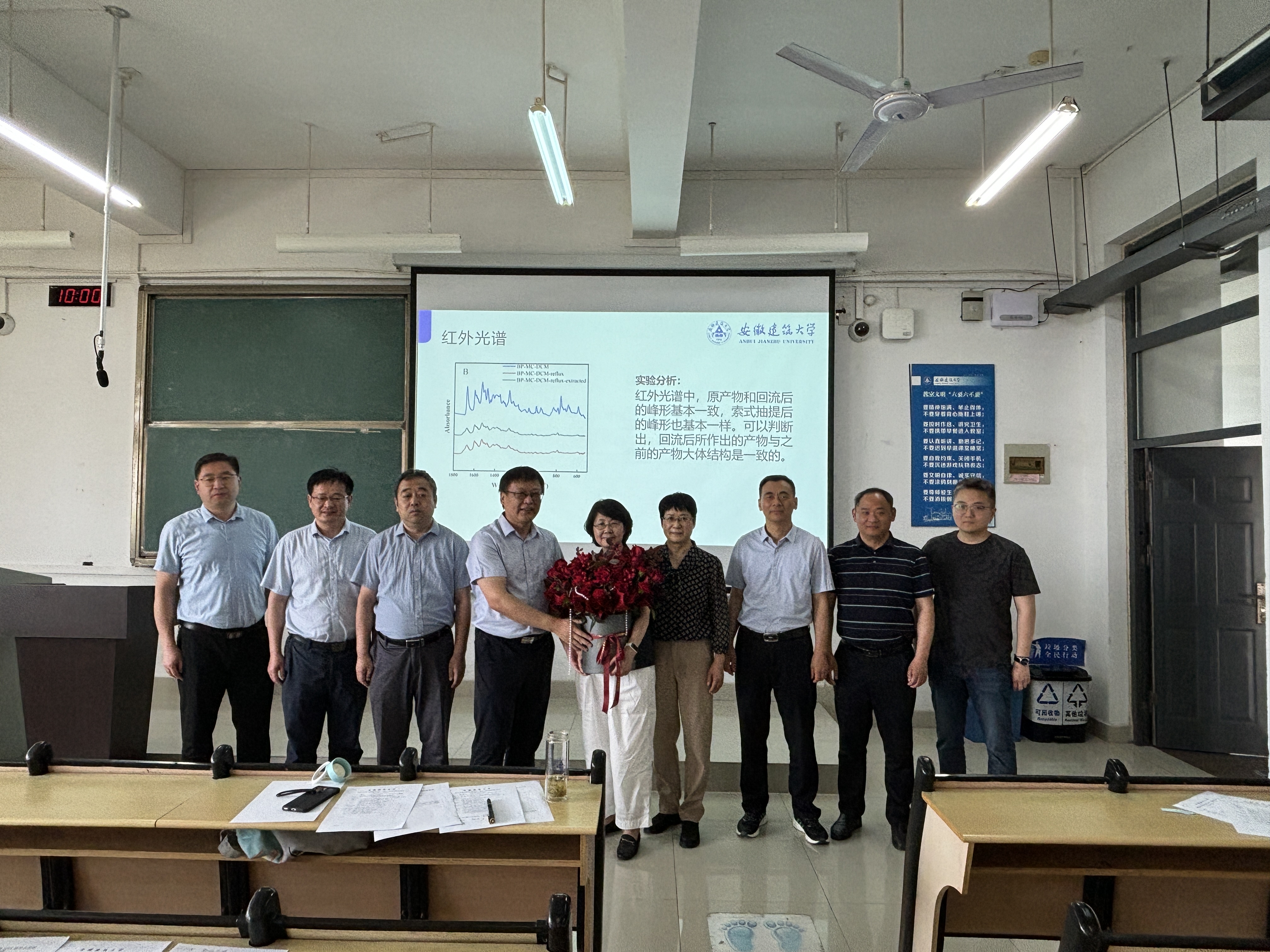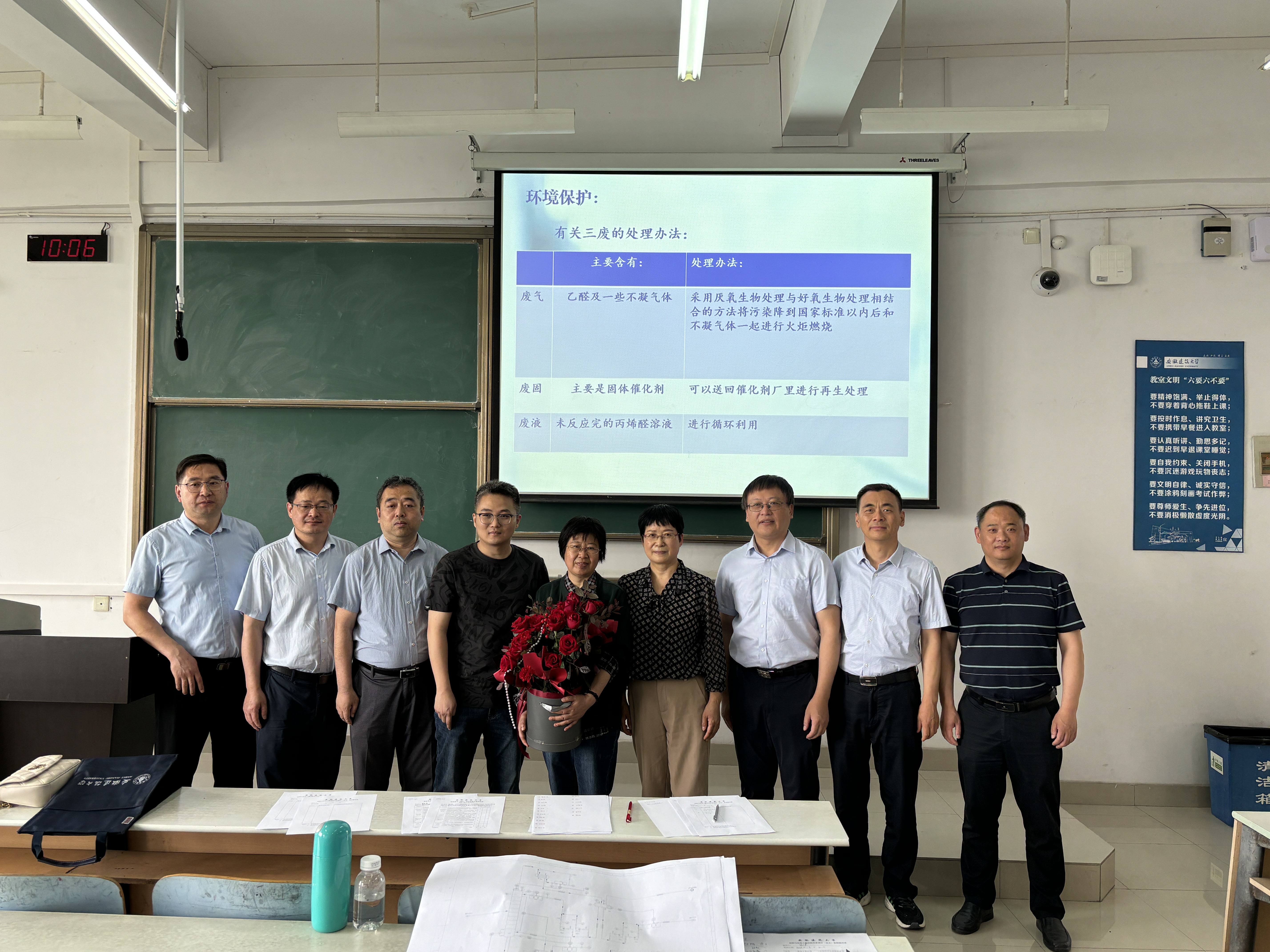 当日,材化学院五个本科专业的毕业论文答辩正在如火如荼地进行。王玉兰一行步入答辩教室时,评委老师们正全神贯注地聆听学生的答辩陈述,现场氛围紧张而有序。为了不干扰答辩进程,校友们悄然走近,轻轻地将鲜花送到老师们手中。当三位教师意外收到这份特别的礼物时,她们脸上都绽放出既惊讶又喜悦的笑容。在场师生也为之动容,纷纷拍照留念,热烈的掌声久久不能平息。