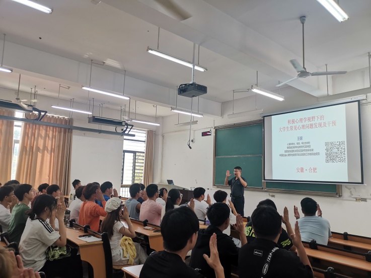 本次培训在王健教授风趣的开场白下正式开始,他借助生动有趣的典型案例,向同学们展示心理问题的类型、影响及积极应对策略。培训紧紧围绕大学生活实际,紧密结合大学生年龄与身心特点,针对大学生活中经常遇到的新生适应问题、学业困难问题、情感问题、人际交往问题、求职就业问题等相关方面,运用心理学相关理念与方法进行阐释说明,并提出积极有效的应对举措。讲座中播放了心理实验视频,通过视频分享,进一步启发了广大同学们应高度重视心理健康,培养良好习惯,正确看带自我、看待顺逆与成败。