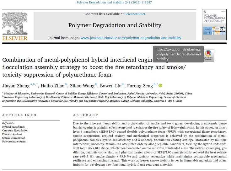 本网讯 近日,针对软质聚氨酯泡沫的阻燃和抑烟减毒方面的研究,beat365在线唯一官网材料与化学工程学院功能高分子研究团队张佳燕老师与四川大学王玉忠院士团队合作,通过金属-多酚络合物杂化自组装和一步絮凝涂覆策略相结合,制备了一种完整的杂化纳米纤维(SEP@TAC)涂覆的柔性聚氨酯泡沫(FPUF)。该泡沫具有优异的阻燃性、抑烟性、低毒性和机械性能。相关研究以“Combination of metal-polyphenol hybrid interfacialengineering and flocculation assembly strategy to boost the fire retardancy and smoke/toxicity suppression of polyurethane foam”为题,发表在国际高分子材料老化研究领域权威1区Top期刊《Polymer Degradation and Stability》上。青年教师张佳燕博士为论文第一作者和通讯作者,四川大学教师曾富容博士为共同通讯作者。该工作得到国家自然科学基金(22175123, 52303061)等项目的资助。