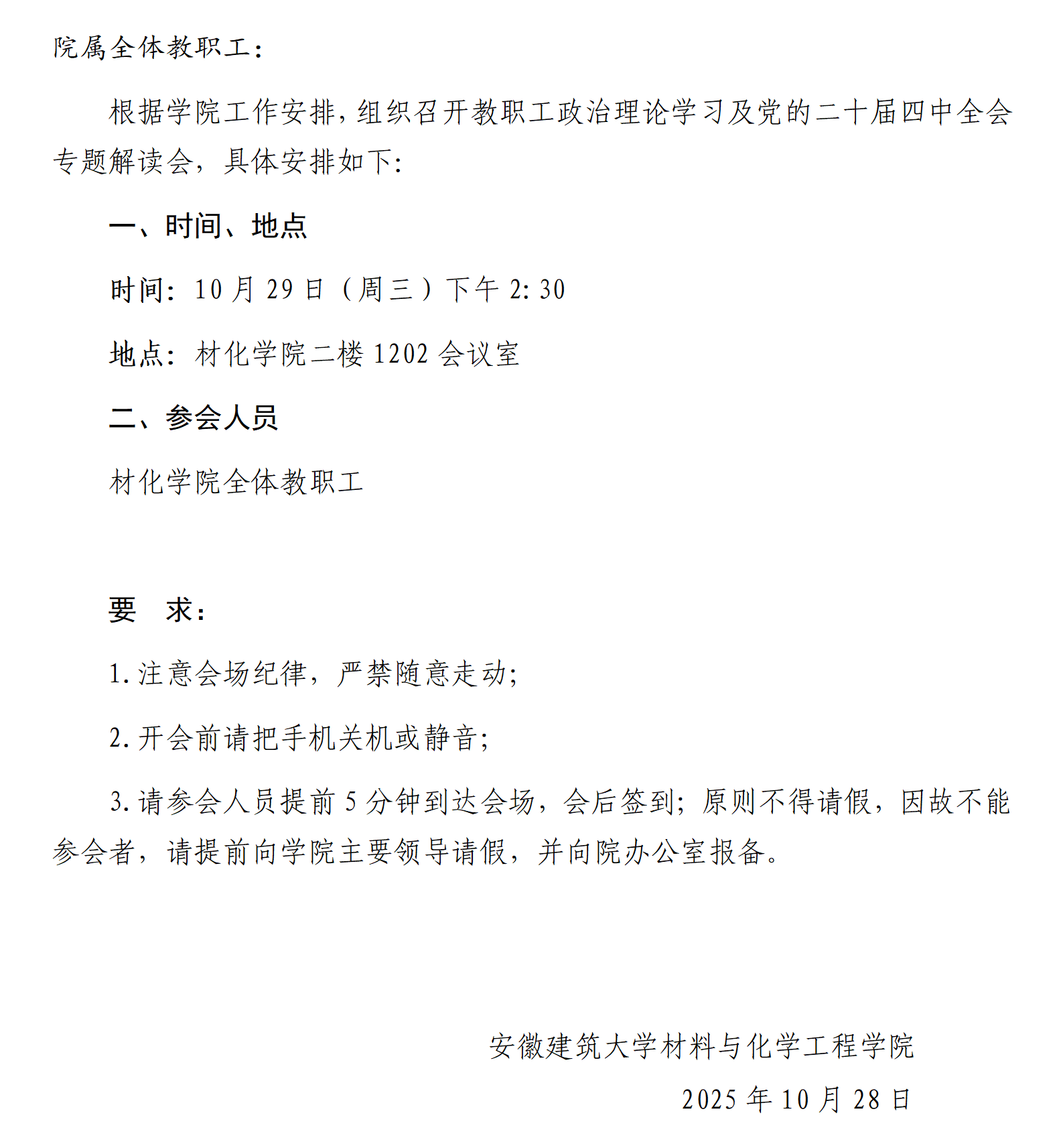 关于召开教职工政治理论学习及党的二十届四中全会专题解读会的通知