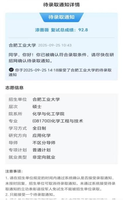 最终,漆蔷薇凭借扎实的专业成绩、丰富的综合素养与党员的责任担当,成功保研至合肥工业大学化学与化工学院化学工程与技术专业(应用化学方向),为自己的本科求学之路交出了一份亮眼的答卷,也将在新的赛道上继续以勤为帆、以志为桨,奔赴更广阔的科研与学习征程。