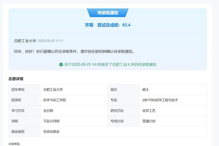面试当天,面对五位老师的提问,齐萌保持了惯有的沉着。当被问及竞赛经历时,她不仅分享了获奖的喜悦,更详细讲述了过程中遇到的困难和解决方法;当被问及科研项目时,她坦诚地说明了个人贡献和收获的成长;当被问及选择锂电池方向的原因时,她从国家能源战略需求和个人兴趣的结合点谈了自己的思考。“老师们很敏锐,他们能看出你说的是真实经历还是准备好的套话。”面试结束后,齐萌有这样的感受。她没有刻意表现完美,而是尽可能真实地呈现自己的学习和思考过程。这种真诚或许正是打动考官的原因之一。