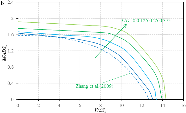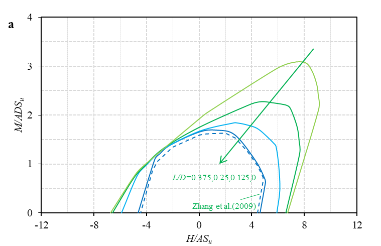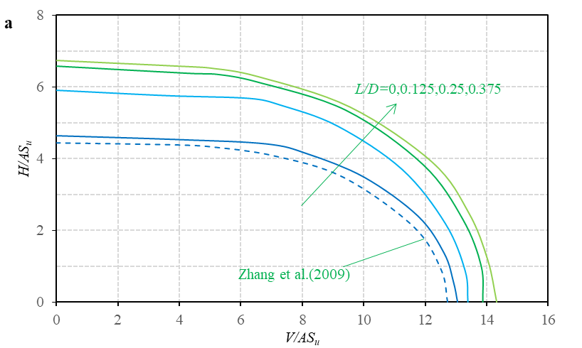 在近海岸油气开采工业中,裙边桩靴基础作为传统桩靴基础的改进形式,可以提供相对较高的承载力和稳固性,以抵抗近海岸恶劣环境所产生的复杂垂直、水平和力矩联合载荷。裙边桩靴基础潜在的承载力等优势有利于移动自升式钻井平台向深水区的延伸。论文采用有限元分析法进行研究,分析了裙边长度和嵌入深度对软粘土中裙边桩靴基础在联合载荷条件下承载力的影响。结果表明,裙边长度和嵌入深度都能显著影响裙边桩靴承载行为,并明显改善联合荷载下的承载力。随着裙边长度和嵌入深度的增加,破坏包络的大小逐渐扩大,其形状也相应发生变化(图 2);当采用0.25D长度裙边、嵌入到大约2D的软粘土中时可以获得最佳的实际应用效果;通过数据拟合获得了代数表达式来解释和预测有裙边的裙边桩靴基础的承载力行为。该项成果将对裙边桩靴基础的设计和实际应用提供初步参考和指导。