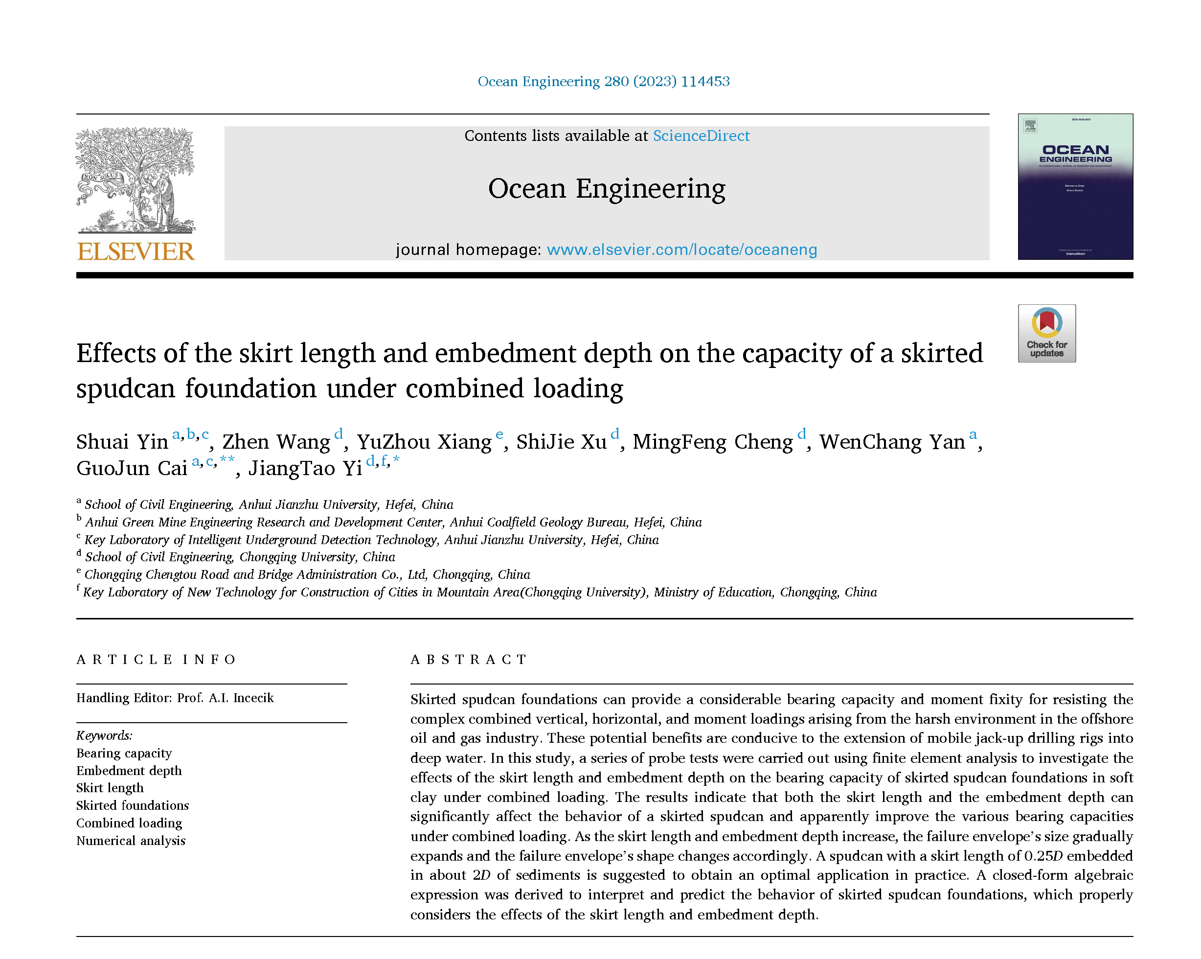 近日,工程海洋领域1区TOP期刊OceanEngineering在线发表了beat365在线唯一官网土木工程学院、安徽省智能地下探测技术研究院蔡国军教授团队的最新科研成果“Effects of the skirt length and embedment depth on the capacity of a skirted spudcan foundation under combined loading” (图 1)。该论文第一作者为我院2021年新引进青年教师殷帅博士,通讯作者为beat365蔡国军教授和重庆大学易江涛教授。该项研究工作分别得到了国家杰出青年科学基金项目(42225206),国家自然科学基金项目(41877231,42072299),重庆市自然科学基金项目(CSTB2022NSCQ-MSX1288),安徽省高校自然科学研究项目(2022AH050234),安徽省绿色矿山工程研发中心开放基金(KCY-KFJJ-4)和安徽省博士启动基金项目(2022QDZ28)的支持。