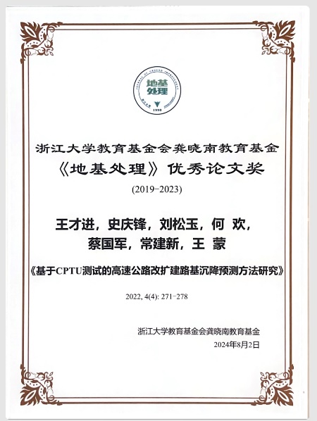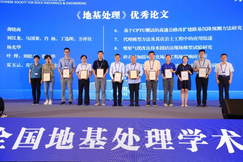 在《地基处理》优秀论文颁奖环节,课题组成员王才进作为第一作者、蔡国军教授作为通讯作者所发表的论文“基于CPTU测试的高速公路改扩建路基沉降预测方法研究”获得优秀论文奖。此外,课题组成员何欢、陈瑞锋分别做了题为“砂浆覆膜对再生骨料力学特性影响机理研究”、“考虑活性离子影响的改性RHA固化黏土早期性能动态发展机制研究”的精彩报告。