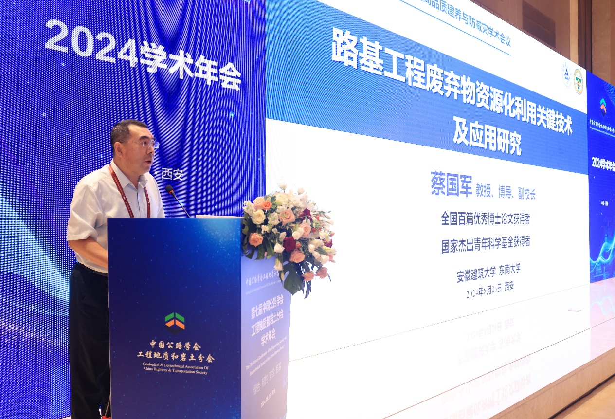 蔡国军教授受邀在本次大会“极端环境工程地质灾害勘察技术与发展动态”分论坛做特邀报告,报告题目为“路基工程废弃物资源化利用关键技术及应用研究”,主要介绍了建筑渣土路堤填料细观表征及内部状态演化分析、再生纤维路基土微观加固机制及宏观力学表征以及路基工程废弃物资源化利用长期服役性能评价,报告得到了与会专家学者的高度好评。