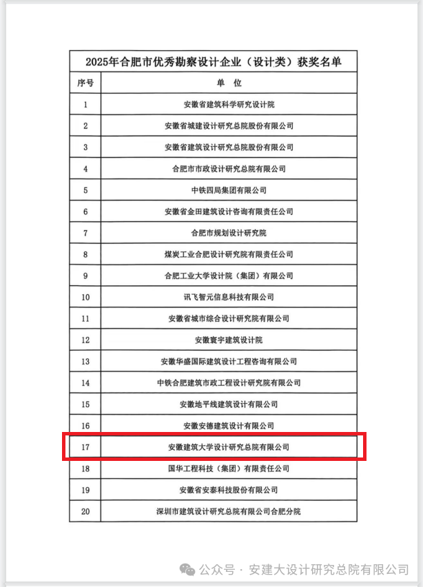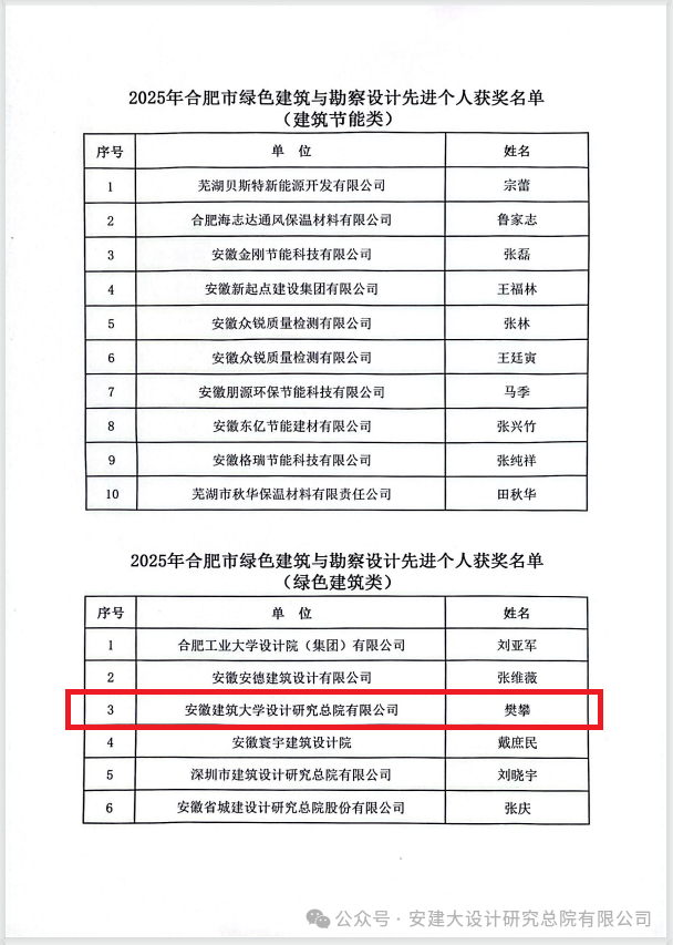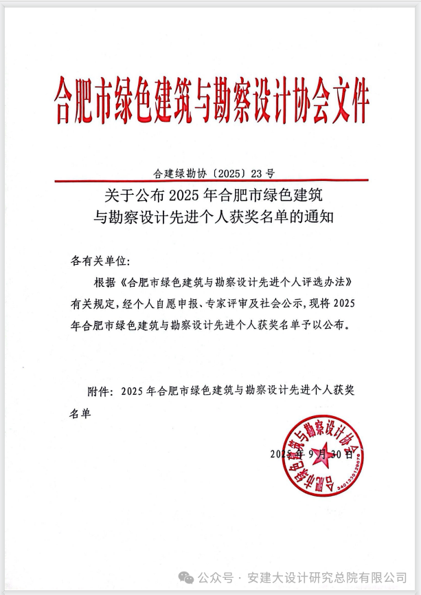 本网讯:近日,合肥市绿色建筑与勘察设计协会发布《关于公布2025年度合肥市优秀勘察设计企业名单的通知》(合建绿勘协〔2025〕21号),beat365在线唯一官网设计研究总院有限公司被评为2025年度合肥市优秀勘察设计企业;员工樊攀荣获2025年合肥市绿色建筑与勘察设计先进个人。