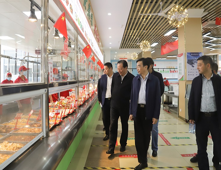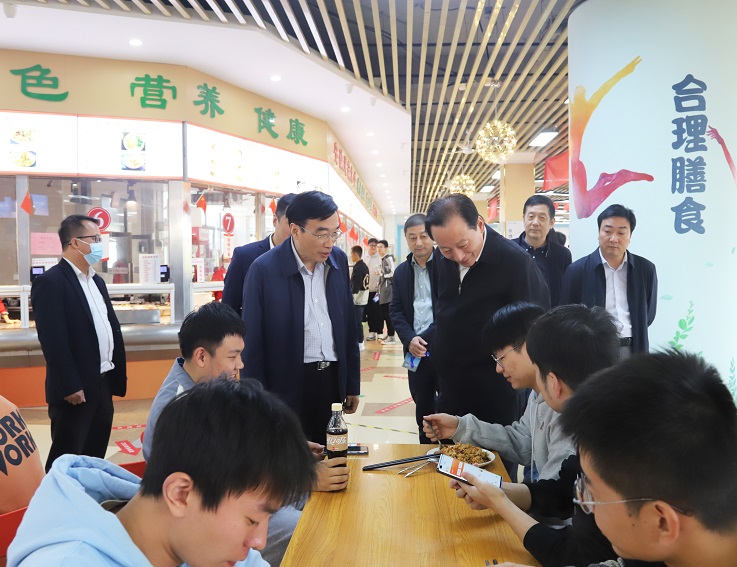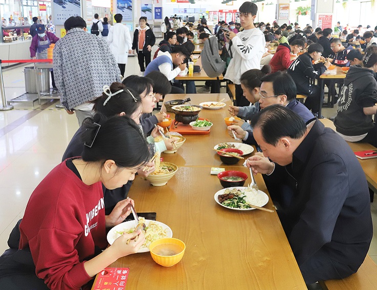 孙道胜一行首先来到学生食堂,实地察看食物售卖、加工操作、就餐环境、就餐秩序、后堂及明厨亮灶等情况,详细了解售卖窗口分布、饭菜花色品种、价格质量。与同学们一同就餐,亲切交谈,询问他们饭菜质量如何、口味怎样,能否吃得饱、吃得好,听取他们对食堂的意见建议。孙道胜强调,后勤集团要加强对食堂的监督管理,营造干净整洁的卫生环境,提高饮食质量,严防食品安全底线,牢固树立责任意识,为师生提供安全放心的餐饮服务。