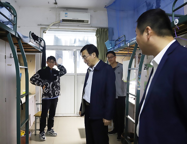下午,孙道胜深入学生公寓,检查指导疫情防控、卫生保洁、公寓安全、设施设备维修等工作,实地查看了洗衣房、开水间、洗浴间,详细询问淋浴间浴位配比是否满足学生需求。深入学生宿舍,与同学们亲切交谈,深入了解住宿条件、学业进展、业余生活等。在18#102宿舍,孙道胜看到宿舍顶部有漏水痕迹、日光灯不亮,现场责成物业公司立即维修,并要求后勤集团要进一步加强日常维修监管,做好学生生活学习服务保障。