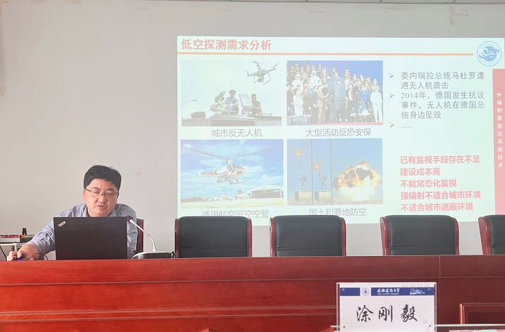 涂刚毅教授作了题为“外辐射源雷达系统技术研究”的学术报告。涂教授介绍了国内外辐射源雷达技术进展情况,分析5G和GNSS等外辐射源信号特点及优势,介绍项目组相关关键技术研究进展,展望了未来的技术发展方向。