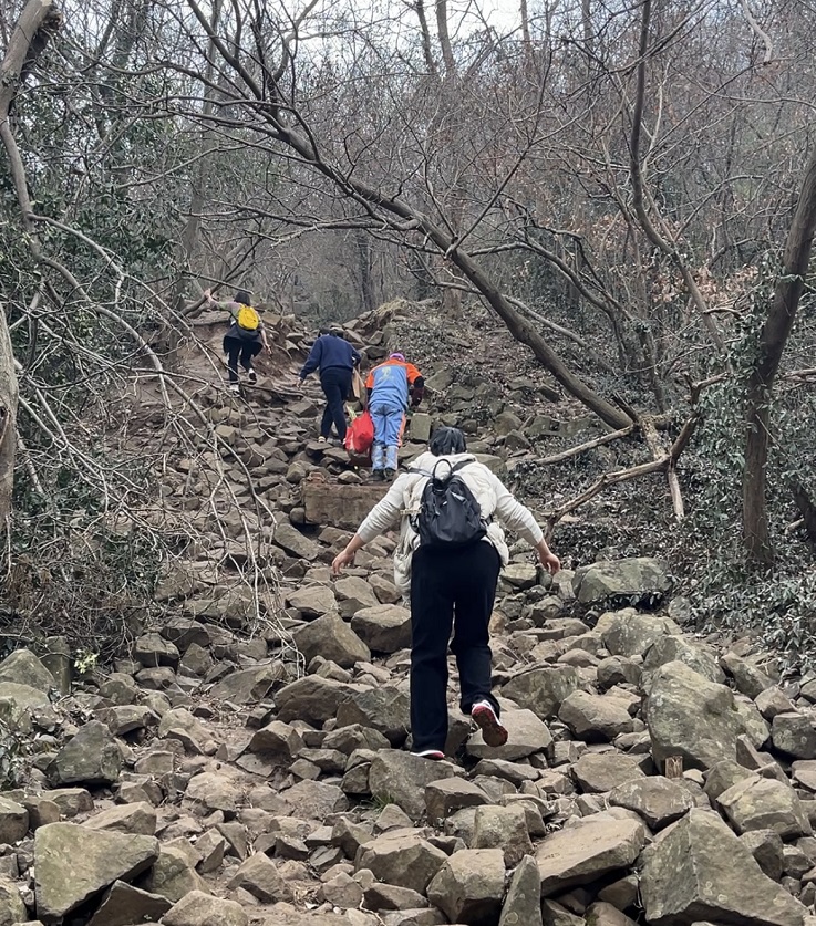 活动当天,天空一扫前几日阴雨。学院女教工们热情高涨,在裁判指令下大家争先恐后,你追我赶从山脚出发,沿登山路线快步前行。随着比赛的进行、路程的增加,参赛人员体力消耗巨大,大家相互鼓劲加油,挽手而行。最终,全体参加女教工均登顶成功,并按照抵达终点先后顺序,产生一、二、三等奖。