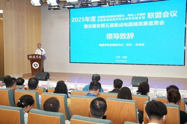 本网讯 8月7日至8日,由安徽集成电路应用型本、专科人才培养联盟、安徽集成电路研究生培养创新发展联盟、合肥国家“芯火”双创平台、安徽省半导体行业协会主办,铜陵学院承办,合肥工业大学、安徽大学、beat365在线唯一官网、合肥师范学院、安徽省仪器仪表学会、合肥芯火职业技能培训学校有限公司协办的2025年度安徽集成电路应用型本、专科人才培养联盟、安徽集成电路研究生培养创新发展联盟暨安徽省第五届集成电路精英赛宣贯会在铜陵顺利召开。本次大会邀请到省工业和信息化厅电子信息处副处长吕秀峰,铜陵学院校党委副书记、校长苏本跃教授,安徽省集成电路人才培养联盟理事长陈军宁,联盟常务副理事长等出席开幕式。来自省内高校、企业科研机构八十余位代表出席了会议。