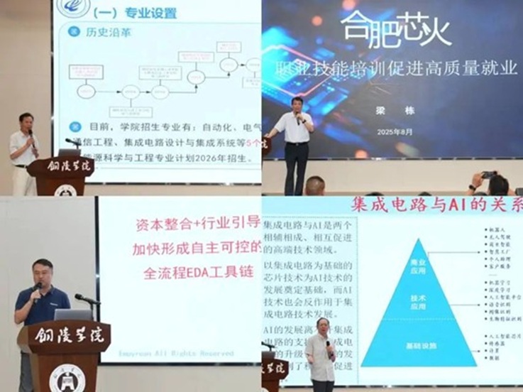 在专题报告环节,铜陵学院电气工程学院院长周松林、合肥芯火职业技能培训学校校长梁栋、华大九天市场部负责人余涵和联盟理事长陈军宁教授分别以《集成电路设计与集成系统专业建设成效及发展规划》、《职业技能培训促进高质量就业》、《新形势下国产EDA创新发展新机遇》和《人工智能与集成电路人才培养》为题做了报告。