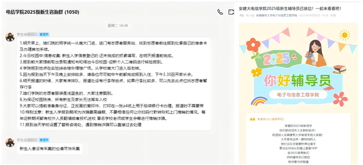 除了线下服务,学院还建立了“新生迎新咨询群”,志愿者们提前在群内为新生解答各类问题,累计回复消息超2000条。针对部分偏远地区新生和家庭经济困难新生,学院还安排了 “一对一” 帮扶志愿者,从接站到报到全程陪同,让新生感受到家的温暖。